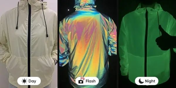 Combining luminous with reflective is definitely a wonderful tech that attracted numerous fashion designers. During the day, the fabric made with phosphorescent compound is charged by exposing to any light source such as sunlight or a flashlight. Then it quickly absorbs and stores the light, then slowly releases the light up to 8 hours in the dark. The fabric is milky white in daytime, and when it becomes darker, it will emit green light, the darker the greener. However, when light shines on it, it will reflect in aurora rainbow spectrum that amazed and impressed people around.