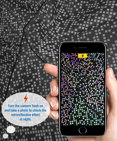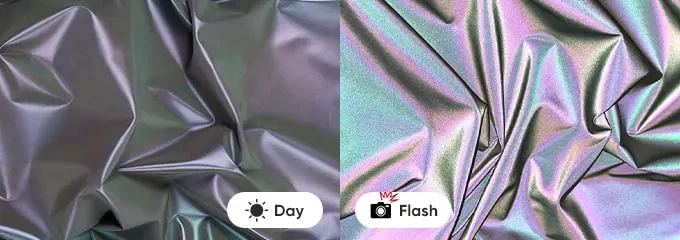 Most of the rainbow reflective fabric on the market is modest black in daylight. We also developed transparent rainbow coating as to keep the pattern of base fabric unchanged. In daylight, the coating is transparent and almost invisible, at night, it shows incredible aurora rainbow effect. The big contrast makes it the favorite of fashion designers.
